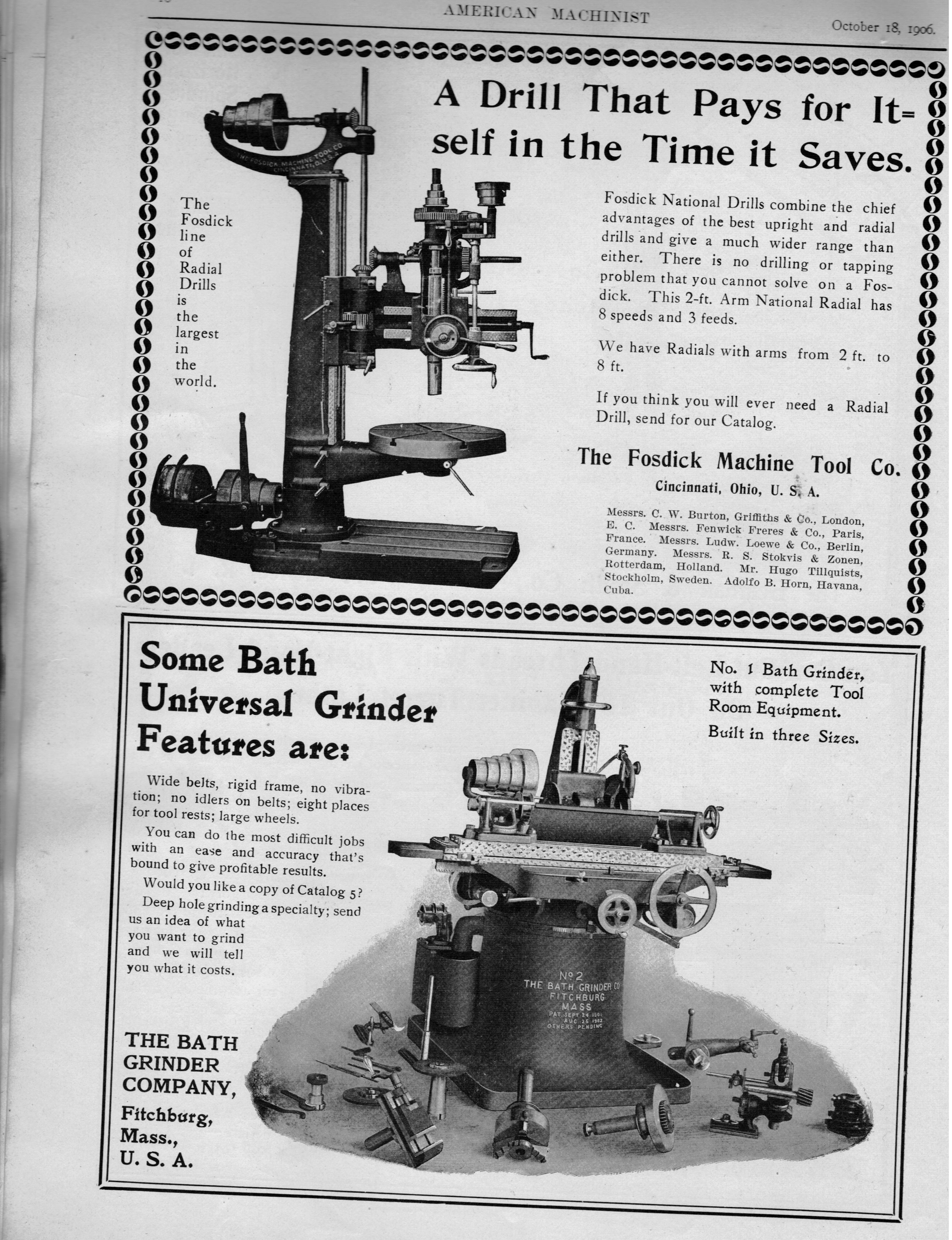 Bickford Drill Co. of Cincinnati, O. manufacturer of Upright Drills; Springfield Glue & Emery Wheel Co. of Springfield, Mass. manufacturer of Emery &