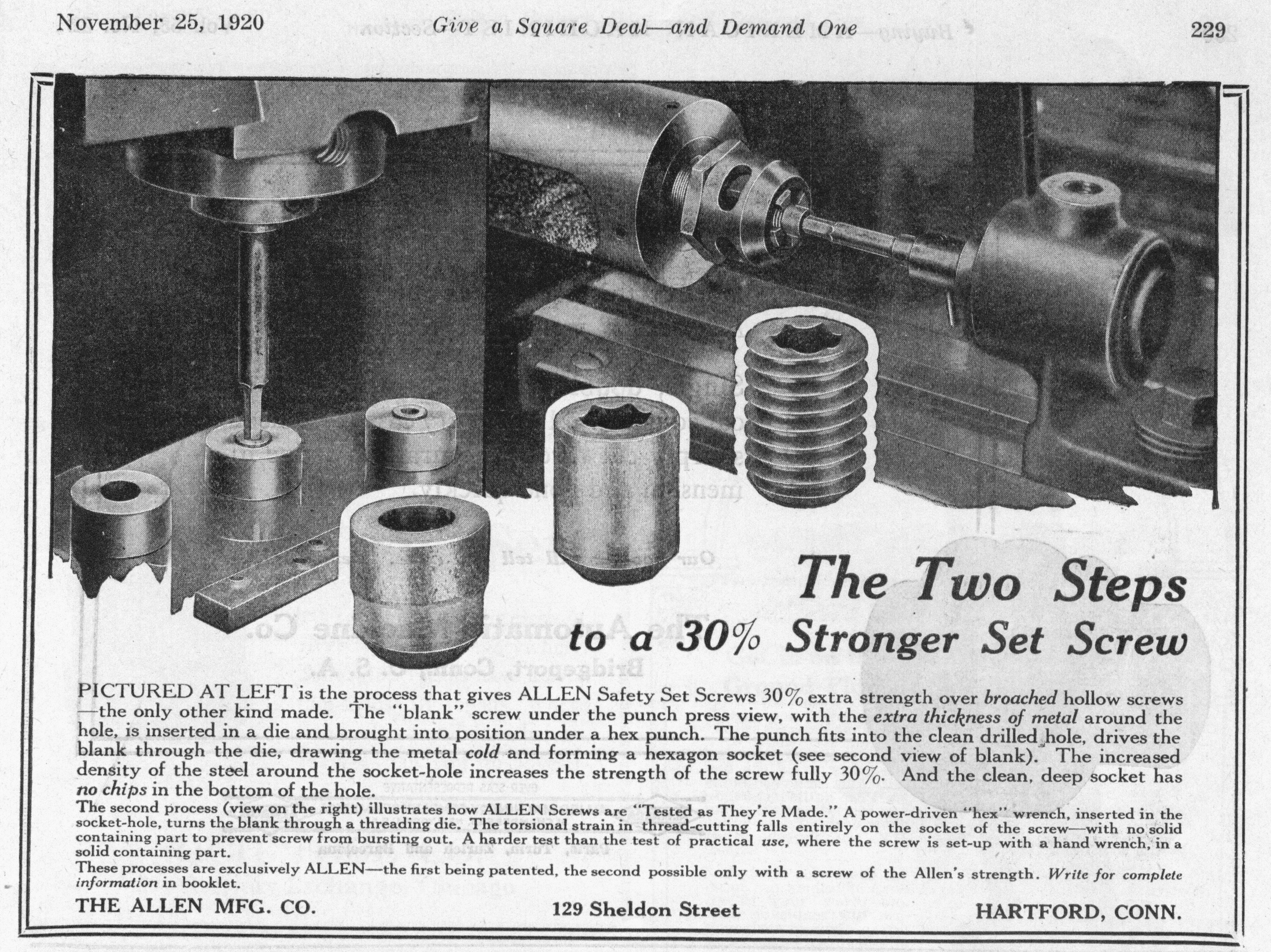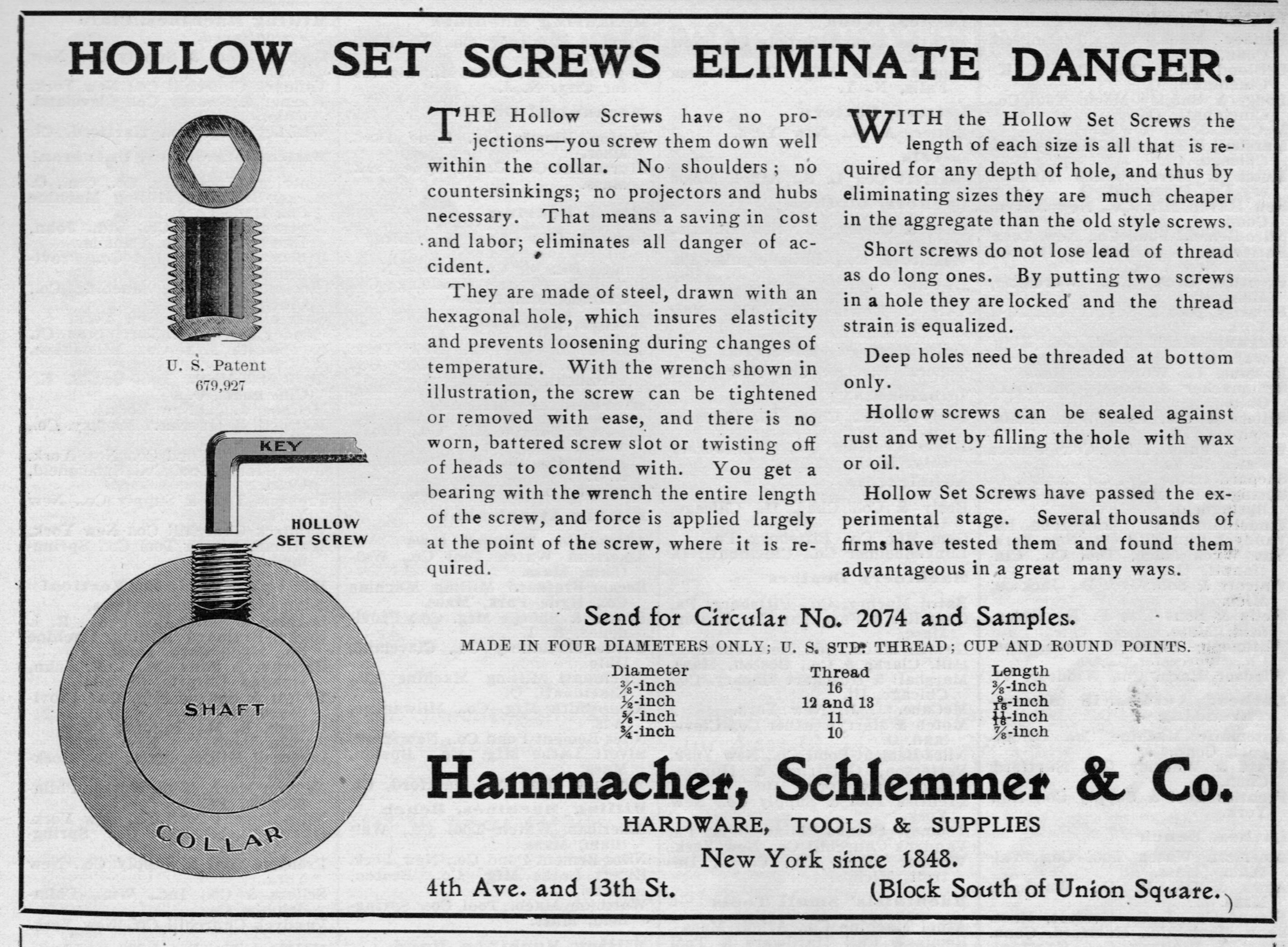 Almond of Brooklyn, N.Y. manufacturer of the Almond Drill Chuck; Worcester Machine Screw Co. of Worcestor, Mass. manufacturer of Set, Cap &