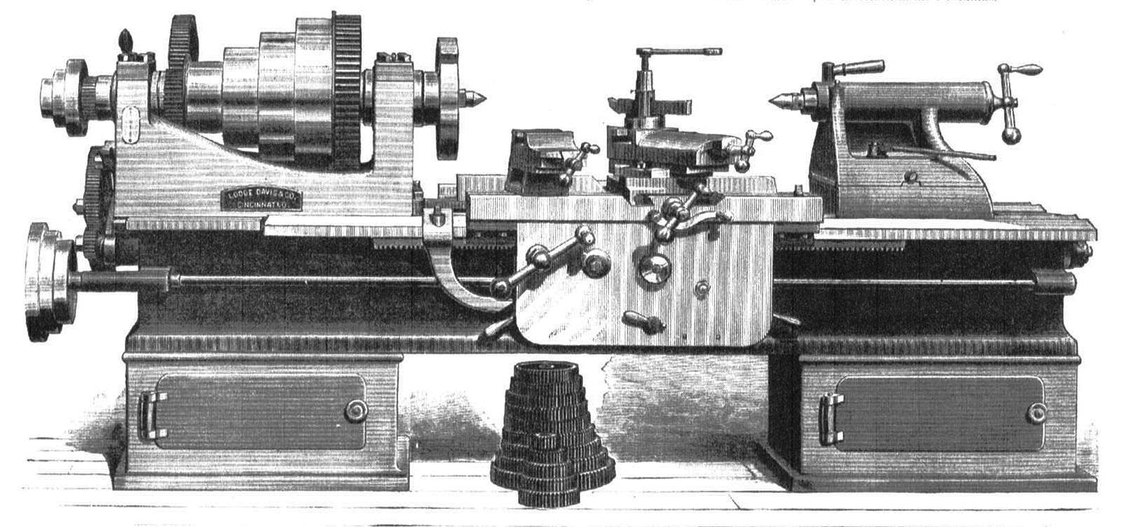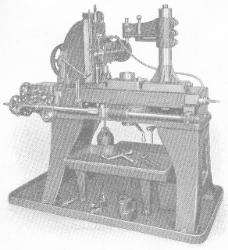 as the head and tail stocks and had no more pretense to an apron than a bracket carrying a cast—tooth pinion meshing in a cast—