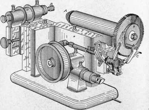 gear blank on the spindle A, and the cutter on the spindle B. The indexing mechanism is at C, and