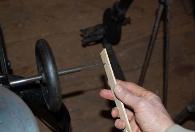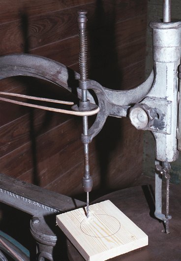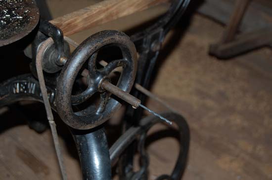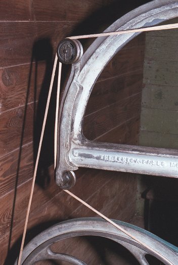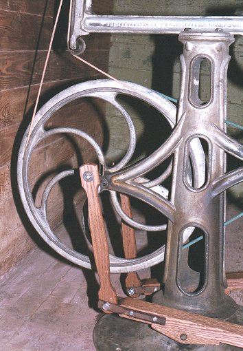 flat belt would be riveted. One belt would connect to the treadle and the other, wound in reverse on its pulley, would go to a