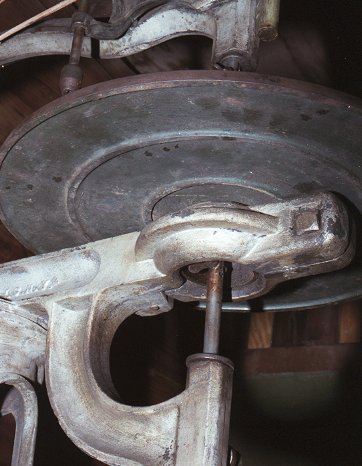 clutch on the front of the shaft and a tight and loose pulley set on the back. The clutch has two pulley faces to which a length of