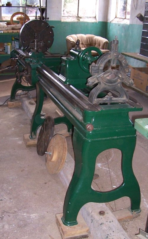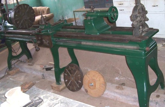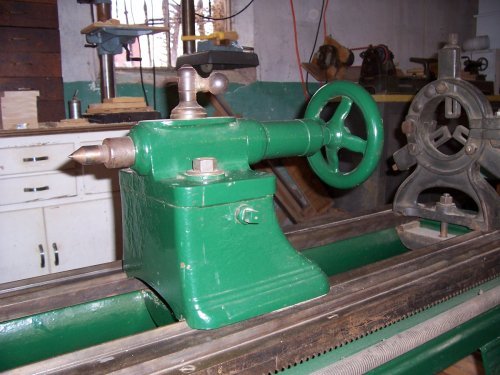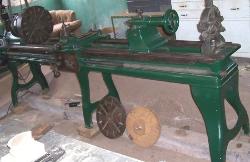 The lathe has a 10 ft bed supported on three pairs of decoratively shaped legs. 18" throw, 10" over the slide rest, 82" between centers. MT 3 tail and MT